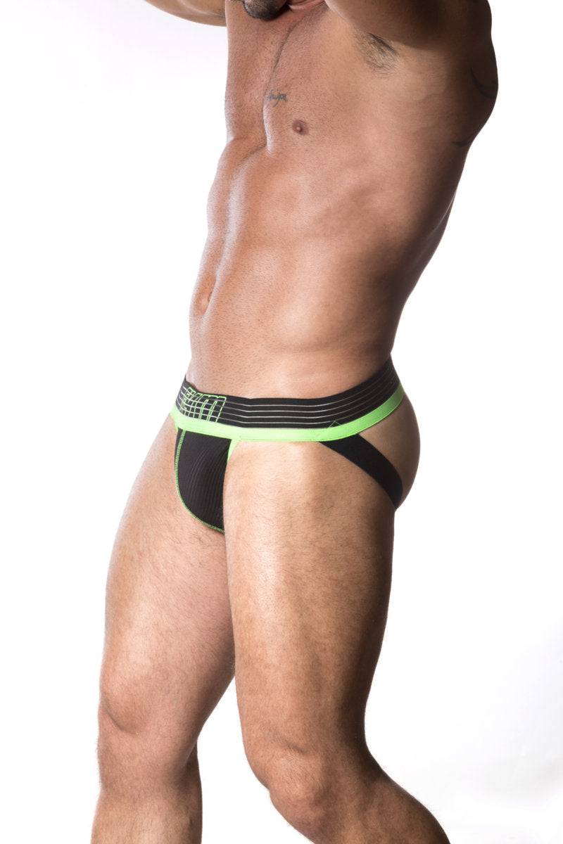Introducing the GYM Neo Jockstrap. This jockstrap is made of the finest polyester/elasthane fabric which offers plenty of stretch in the pouch yet is a very quick-drying material. The pouch is incredibly soft and stretchy. Great for physical activity or a long day at work. Features a full 2" thick waistband with the GYM logo printed in Neon. The pouch and bottom of the waistband are accented with neon green piping. The legstraps are 1.25" thick. Available in Black or White. Fabric: 94% Polyester/6% Elasthane.